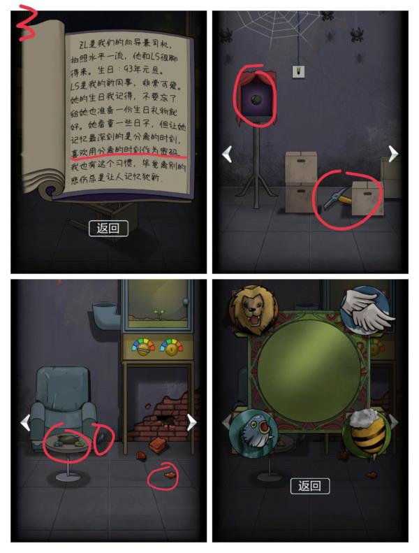 3、进入咨询处,在书桌抽屉拿到毛笔剪刀火柴,翻日记得到提示“用离别的日子做密码”,把电池放进喇叭里得到游乐园关闭时间,结合得出密码92513,开门口箱子得到胶带;照相机旁边纸箱下拿到锤子;培养箱左沙发旁边捡到石杵。锤子凿开培养箱下面的红砖,捡碎片,剪刀剪开拼合的玩偶,再把4个部件放回4个对应圈圈。