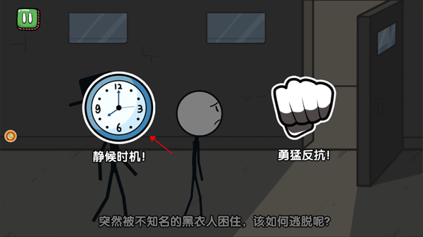 2、进入到游戏后火柴人在被不知名黑衣人困住之后,出现了两种选择,不同的选择结果会有所不同,选择“静候时机”