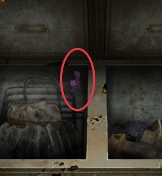 11、去右房间,左边冰柜拿块【冰】,记住旁边的【紫色线索】1。
