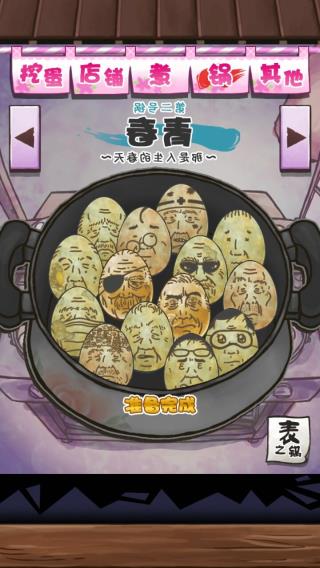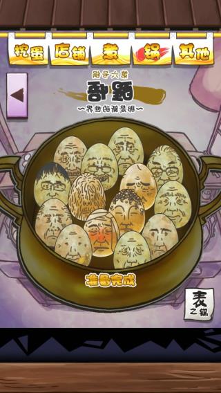 1、游戏中玩家需要花费时间,搭配各种盐配料,煮熟鸡蛋,鸡蛋出锅后,用手指滑动屏幕剥开,一张个性的大叔脸就会出现在你的面前。2、一共有190多个不重样的大叔脸,简单的涂鸦描绘却把每个大叔的神情、特色刻画的极其到位。190多位大叔不仅有不一样的脸,职业、性格和趣味也是各不相同,有男扮女装的变态狂,有疑神疑鬼的妄想症患者,有爱吃关东煮的德国大汉等等,绝对让玩家大开眼界,节操荡然无存。