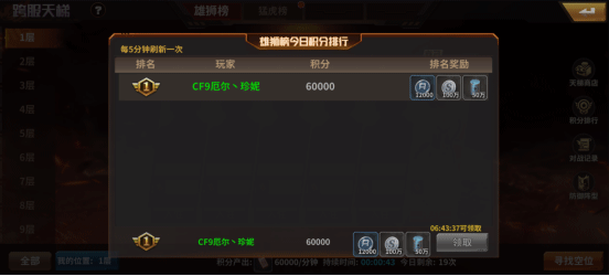 1.跨服天梯共有200层,每层有6个席位,每个席位都有对应的积分,占领可持续获得积分,排名越靠前,每分钟的积分越多。