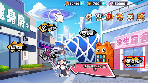 2、首次进入游戏界面完美可以看到次元战争、训练场、竞技场、英雄信息以及一个猫咪商城;