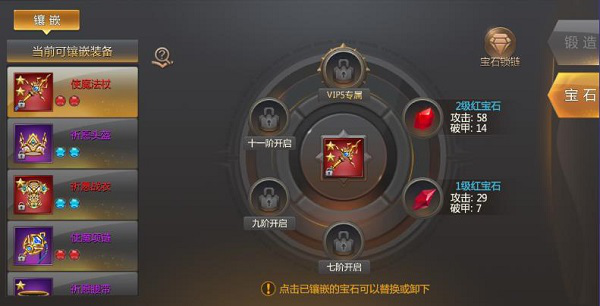 【宝石镶嵌规则】每个装备最多可镶嵌6个宝石,同一装备不可镶嵌相同属性的宝石。宝石镶嵌孔数根据装备除数而定,高阶装备替换低阶装备时,低阶装备自动返回到背包里。点击已镶嵌的宝石可替换或卸下。
