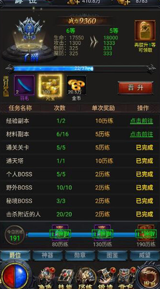 玩家完成历练之后就能提升爵位等级了,每提升一级就能获得元宝、金币和材料奖励了。