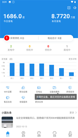 1、通过它您可以随时随地关注电站的发电、收益情况和设备的运行状况。2、使用“附近电站”功能,您可以一键筛选附近的问题电站,提高运维管理效率。