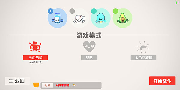 美食之王是一款趣味动作射击类竞技游戏,支持中文与英语两种语言,采用清新的背景画面以及Q萌的各种食物小人,为玩家带来满满的治愈感,而在游戏中玩家需要做的就是利用手中的武器击败其他对手从而成为食物之王!操作方面也十分简单,除了近战以及远程攻击外还可使用跳跃来越过河流,而且使用的远程攻击还可将回旋镖在投出之后利用返回的回旋镖来阴人,十分有趣。目前除了自由击杀的比分模式外,还拥有组队模式以及金色回旋镖模式,为玩家带来更多乐趣。喜欢的朋友快来本站下载开始游玩吧。