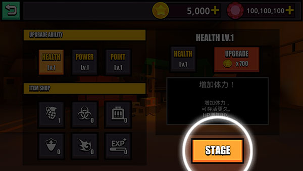 3、进入关卡之前,我们还可以购买一些增益道具,以便我们能够更加轻松地通关,购买完成后继续点击STAGE按钮。