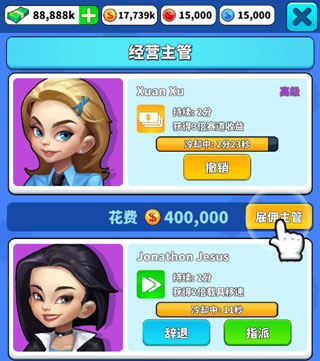 每次在合成高等级的汽车后,都将扩大停车位的获取,由此增加的格子数,可以放置更多的赛车。在赛车运营期间,玩家可通过雇佣经营主管来加速关于赛车在赛道中的奖励获取条件。不同的主管对于赛道的加持收益会有大不同