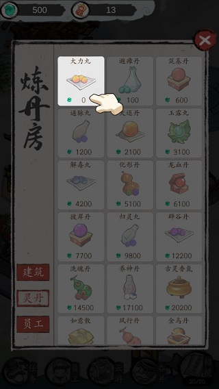 2、虽说是一款以修仙为主的放置挂机游戏,但该作融入了建筑建设、经营等元素,完成上述操作步骤后,接下来就是赚钱,因为这里的所有开销都需要你来支付,至于赚钱的方式很简单,卖点丹药,正好小师弟会这项手艺。