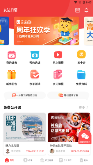 涵盖零基础到N1各个级别课程,根据友达日语定制考级教材,系统学习日语知识,更有口语、语法、词汇、阅读、写作等专项提升课配合,让学员在听、说、读、写上全面扎实掌握日语。