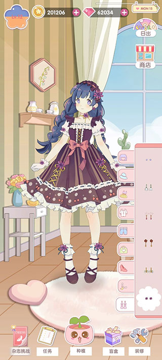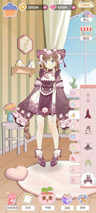 玩法方面就是种花,得装扮,之后闯关,家具建造算是单独板块吧,暂时没有看到与主线有联系。C,B级衣服都只有一件连衣裙,没有上下身分开,(A,S还没熟),所以就是一套7件,头发,帽子,项链,衣服,鞋,手饰。