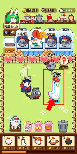 3、将合并出来等级较高的小鸡拖动到上方鸡巢中即可让其生蛋,之后点击左方即可收取鸡蛋换取金钱