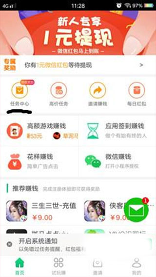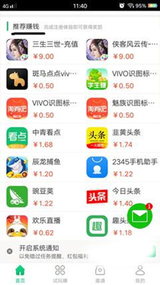 之后可在首页找到“推荐赚钱,”只需要下载安装并体验那些软件就能够获得对应的奖励。