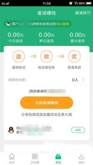 点击“邀请赚钱,”进入页面后再点击“立即邀请赚钱,”邀请到的粉丝完成任务后你就可以得到相应的奖励,或者可以将自己的邀请码分享到朋友圈。