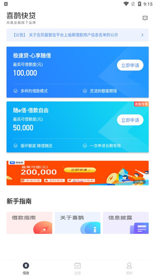喜鹊快贷APP是凤凰金融推出的一款网贷软件,主要为需要快速用钱的用户提供方便。它最大的特点就是额度高,最高可以借到10万元,而且审批速度快,基本上3分钟就能完成申请,最快当天就能拿到钱。操作也挺简单的,用户只需要一张身份证和一个手机号就能申请,特别适合那些没有固定收入但急需资金的人。