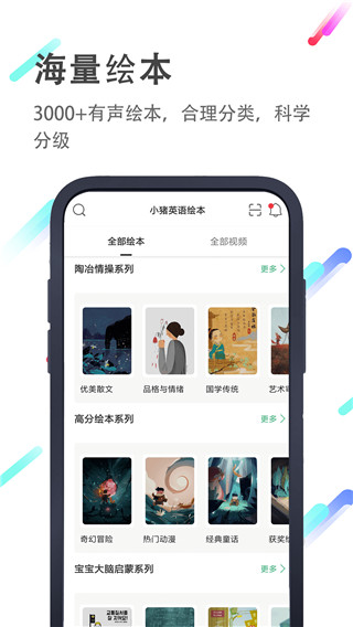 1、高清有声绘本,可以让孩子边看边听2、单绘本多音频:朗读版、歌唱版、跟读版等