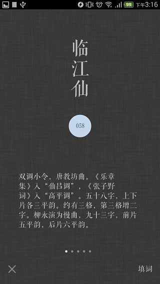 词ci是一款能够自动检测发音平仄、辅助填词的软件,软件打开后选择想要的词牌,就行可以进行诗词填写。在填写过程中,它会自动用不同颜色的标记高亮出发音平仄错误的汉字,帮助你进行正确的修改。同时还可以通过这个方法,十分便捷地找到同韵字,能够随时随地切换当前写作的风格。词ci具有许多独特的背景可以更换,特色的背景看起来像是在一个手工纸笺上进行作词。用户可以将自己做好的词配上独特的手工纸笺背景,生成图片一键分享到朋友圈和微博空间中。