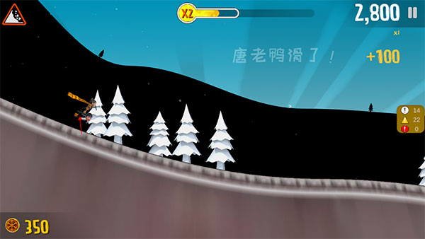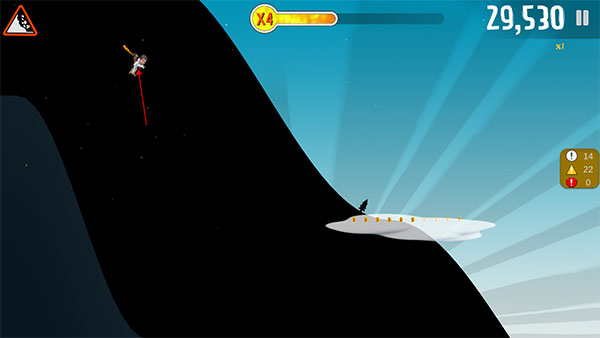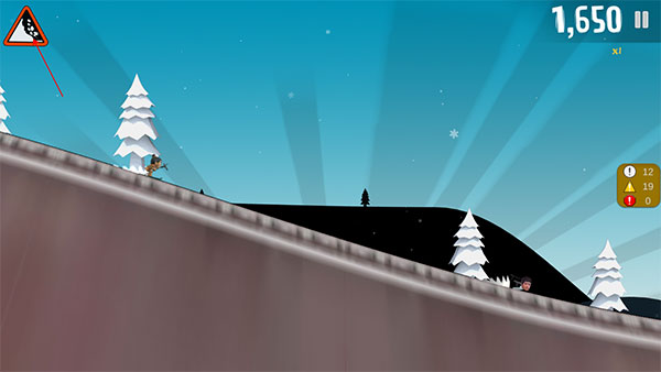 这款游戏无需重力感应,只需要一个手指就可以完成整个操作。。也就是说你躺着也可以滑雪。。一般你要在悬空的时候点击屏幕和有障碍物的时候点击屏幕。悬空的时候一直点击屏幕能够做旋转特技,在落地以后会有加速提成,遇到障碍物的时候点击屏幕可以跳跃躲过障碍物。还有一个地方要狂按屏幕的就是当你倒地的时候要狂点屏幕啊,不然会被后面可怕的雪崩给吞没的。左上角的三角符号的图标就是提示你雪崩的状态,当在不断的闪动的时候就是雪崩马上就到要来了,你要抓紧时间来逃生。