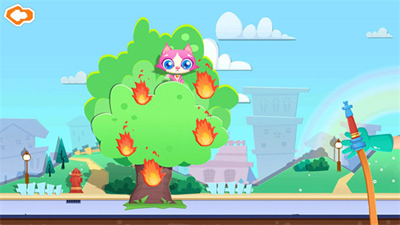 5、有只小猫被困在了树上,我们需要给消防员糖糖搭把手,拖动右边的水管进行灭火。