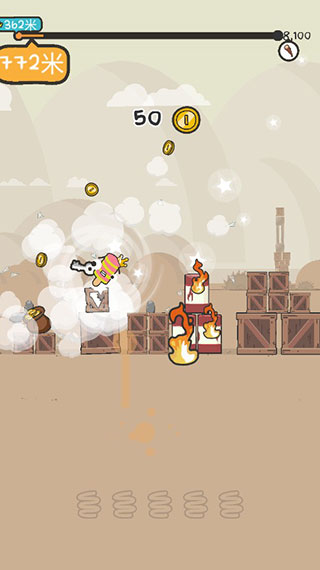 ②我给与玩家的一个技巧就是玩家在刚飞入空中的时候,不要去点击屏幕让自己进行跳跃,而是快落地的时候按下跳跃,然后进行一个加速旋转,这样你就几乎形成了一个37度左右这个角度谈到地上是如果前方不是一个正前方的障碍物,那么你必定会飞起来,然后飞出更高的高度,再进行一个下落。如此往返几次,那距离绝对要比你最开始的弹射要远的多的多,不信的玩家可以自己去式一式。