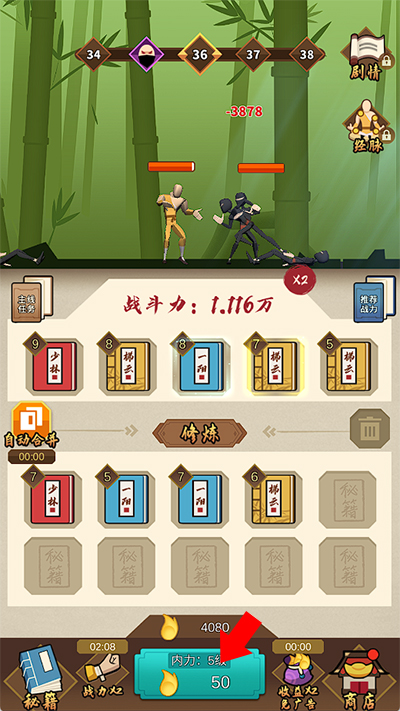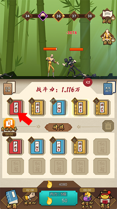 1、进入游戏后,通过点击下方的按钮即可在上方格子中生成秘籍,两个相同等级的秘籍可以合成一个高一级的武功秘籍