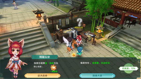 转职系统是游戏的主要核心系统之一,玩家的等级每当到了一定的瓶颈之后,都可以前往转职仙使NPC处接受转职任务。