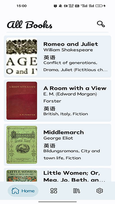 用起来也很简单,点开后直接搜索想看的书就行。如果不知道该找啥,还可以分类浏览。找到书之后点击下载就能看,超级方便。而且这个app不仅支持古登堡计划的资源,还接入了gutendex和Google Books来匹配书籍信息,这样能轻松找到很多经典的英文原版书,满足了很多老书虫的需求。