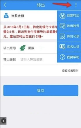 4、点击转出界面右上角的三点功能按钮,会弹出相关的功能选项,例如转出记录、实名认证等;