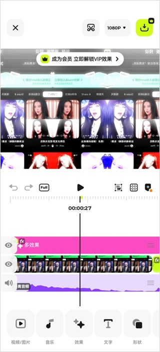 由视效专家团队为你精心打造80余款特效,让你的视频更加炫酷有趣。使用特效功能,让你的视频更加出彩,给你的观众或粉丝留下深刻印象。支持调整图层,在同一轨道内创建多个特效,并自由的编排它们的图层顺序。