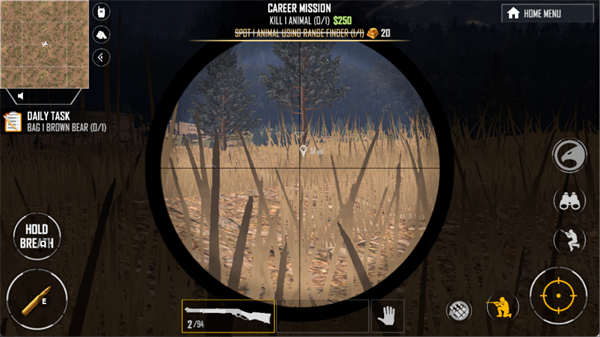 1、玩家需要控制自己的准星,找到合适的视角,一击击杀要狩猎的动物,获取战利品。