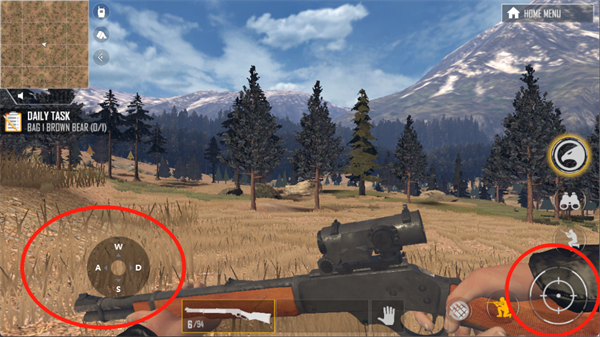 1、屏幕中心范围控制准星,右下角发射子弹,左下角开镜,开镜后镜头边缘滑动可以增加放大倍数,还可以在右下开启红外线;屏幕左右侧都有移动按钮,可以让猎人左右移动来寻找合适视角,但移动范围很有限。