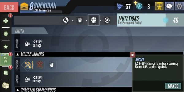 ● DNA 优先 矿工老鼠,升第一个技能 10%产出(DNA,苹果,木头,金币)升级完成后 升级 背包老鼠