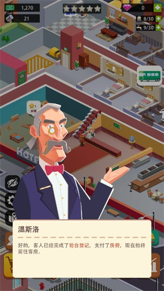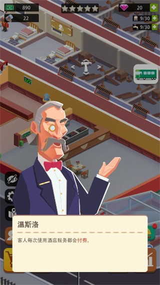4、客人每次使用酒店服务都会付费,这也是玩家主要的经营收入,我们在这里要做的就是用赚来的收入去扩大酒店规模。