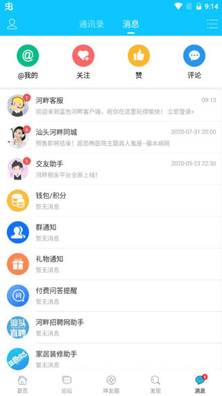 4、进入消息版块,查看各种未读消息内容,和同城好友在线交流,讨论各种话题