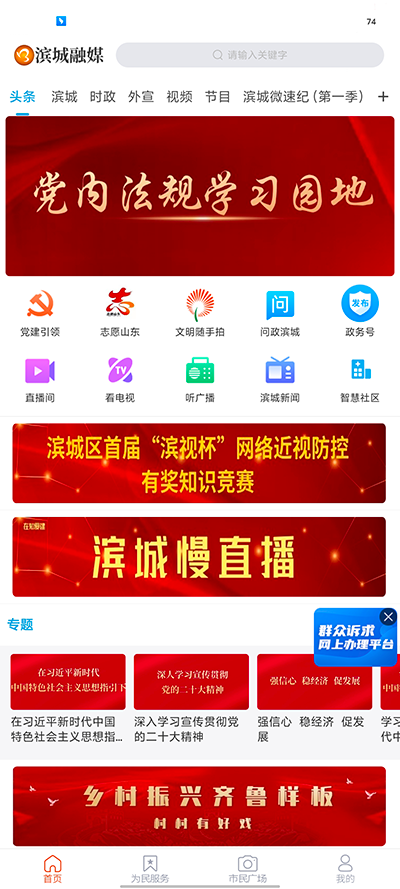 1、第一步:打开滨城融媒app后,点击【市民广场】;