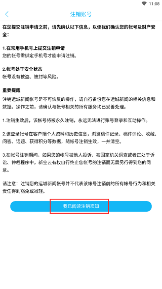 4、阅读注销账号说明后点击下方的“我已阅读注销须知”按钮