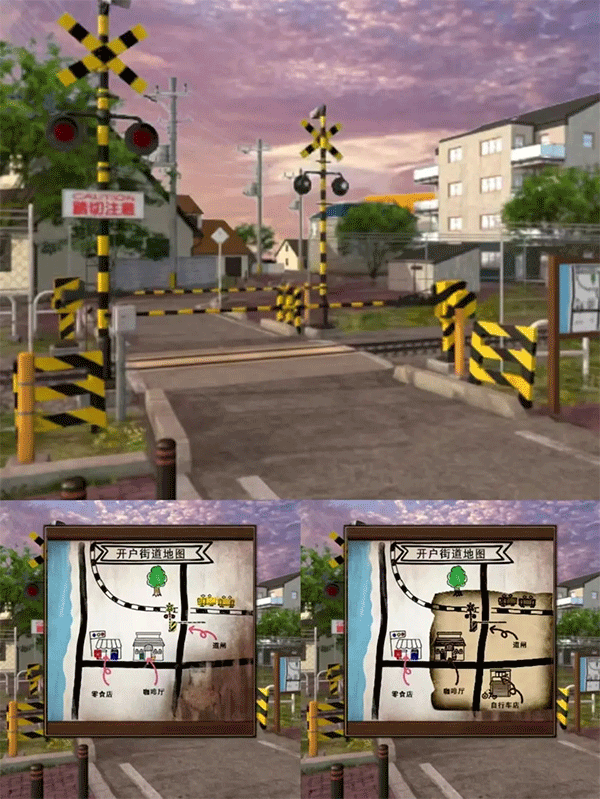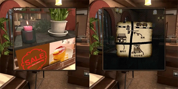 回到咖啡厅把纸放在粉色蜡烛上浮现出半张地图→把半张地图拼在模糊开户街道地图上