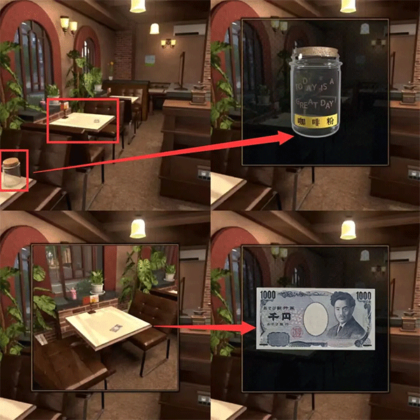 走进咖啡厅拿走店内左手边桌上装咖啡粉的空瓶子以及前面一张桌子上的钞票(钞票后面有用)