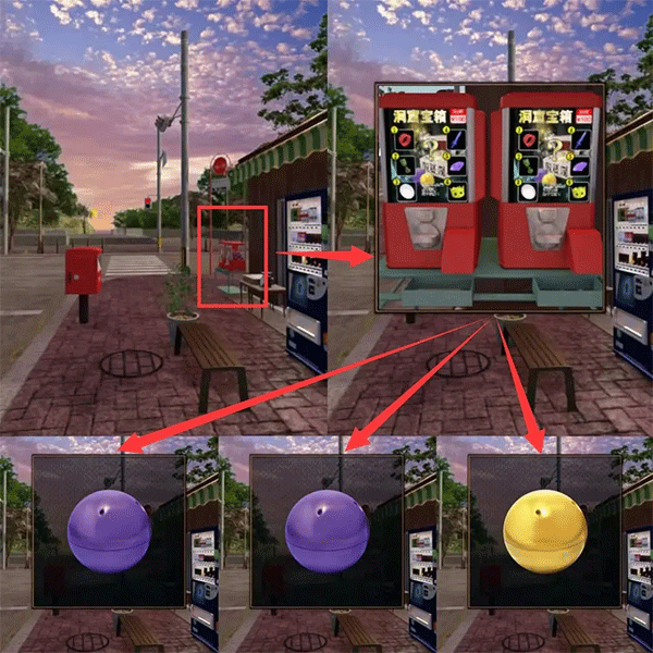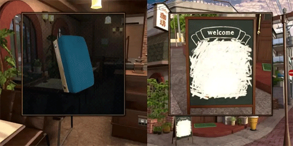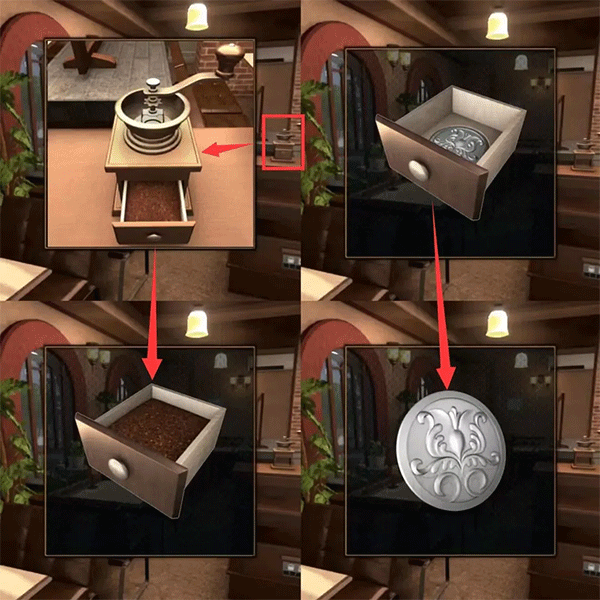 比如,在第一关中,玩家需要在咖啡厅和零食店之间来回探索,收集咖啡粉瓶子、钞票等线索,并通过将咖啡豆倒入研磨机得到“DATE”的提示,最终获得黑板擦。第二关则涉及扭蛋机和密码箱,通过颜色组合解开谜题。