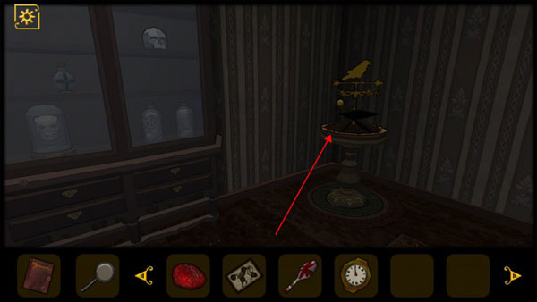4、在留声机的背后获得房门钥匙,打开房门去往下一个房间,入眼即可看到一个钟表,绿色指针指向V