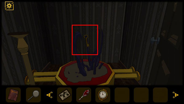 5、查看桌子抽屉,获得道具和查看日记,将红色机关石放入墙上的红色凹槽中,回头会发现进门处出现一只怪物,将门关上,注意门上的花纹
