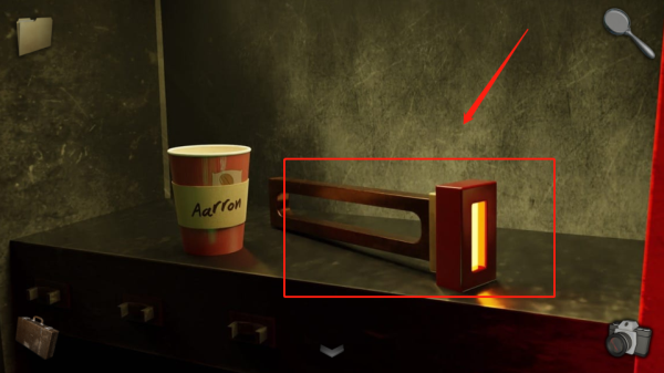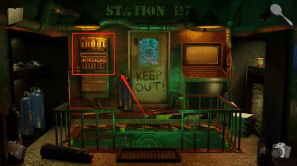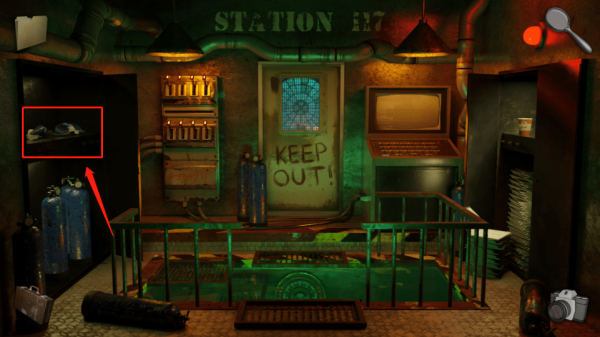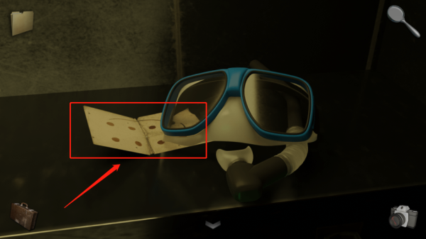 6、点击右侧柜子,点击潜水镜下纸条,根据纸条拉下控制杆