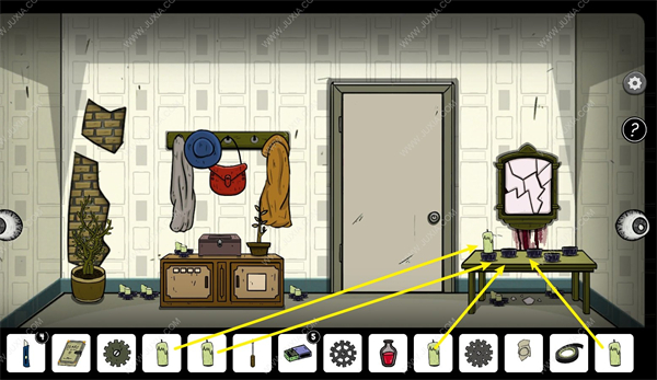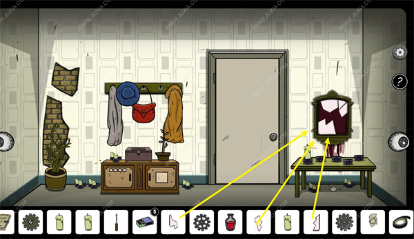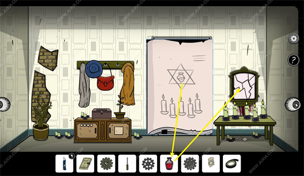 27、回到初始场景,将所有的【镜片】拼到场景右侧残破的镜子上,随后将所有的【蜡烛】放在镜子下桌上的烛盏上,注意放置蜡烛时要按照下方道具栏中蜡烛从左到右的顺序,依次放在从左到右的烛盏中。