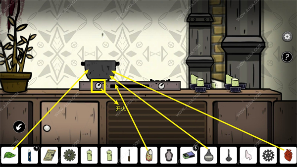 17、打开【日记本】,在【日记本】的记录中找到【汤锅】及其它几个道具的使用方法。按照【日记本】中的描述,将【汤锅】放在灶台上,然后将【树叶】【断指】【心】【水瓶】的水放入汤锅中。点击灶台下的旋钮,将火打开。