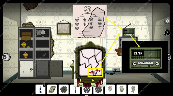 34、运用【日记本】中刚得到的信息,将其与初始场景中镜子上显示的线索相结合,可以得到开启电视机场景中收音机的方式,经计算蝴蝶是2,螃蟹是1,蜻蜓是4,乌龟是3,所以将按照镜子上的提示,将收音机调整到21.43频道,FM即可打开收音机。打开收音机后可以得到收音机所提供的信息“7536”。但要注意框柱每个数字的图形。
