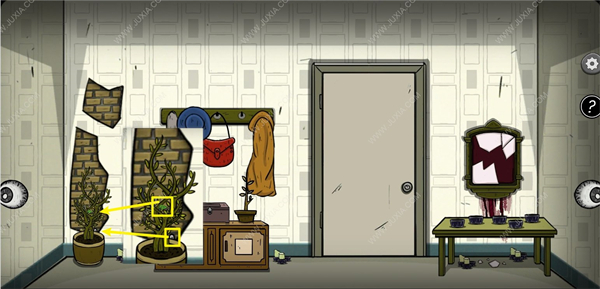 1、在初始场景左下角花盆处拿到【树叶】和【把手】。