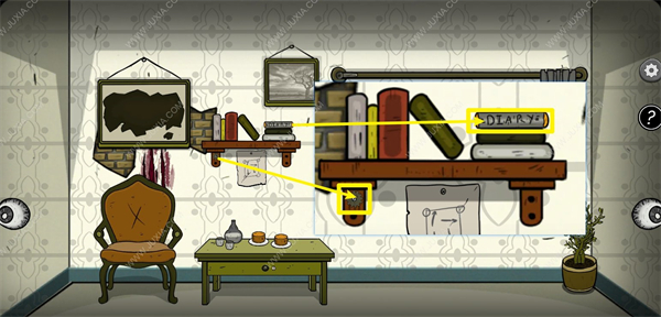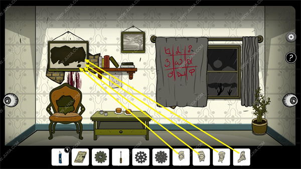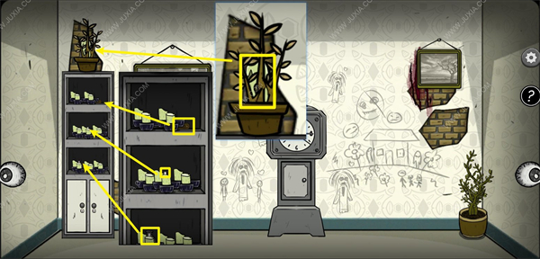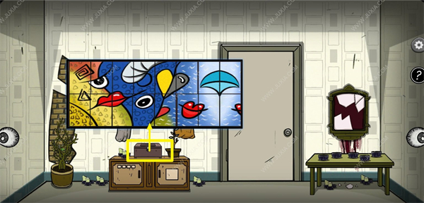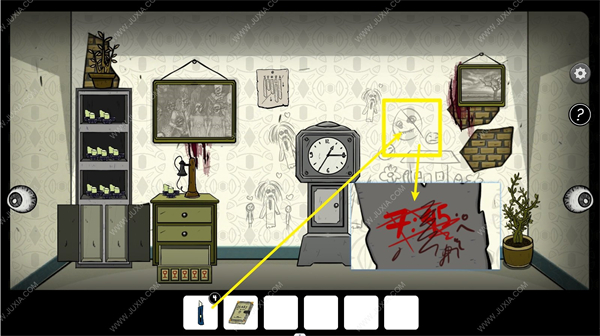 11、利用墙上贴纸提供的线索,将左侧小柜子最下层的抽屉打开,得到【窗帘布】,同时注意右侧墙上图画中右下角隐藏的图案。