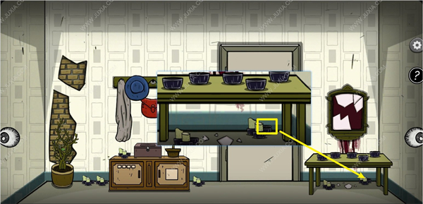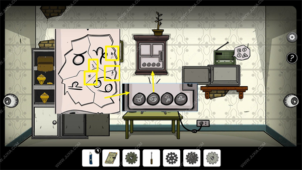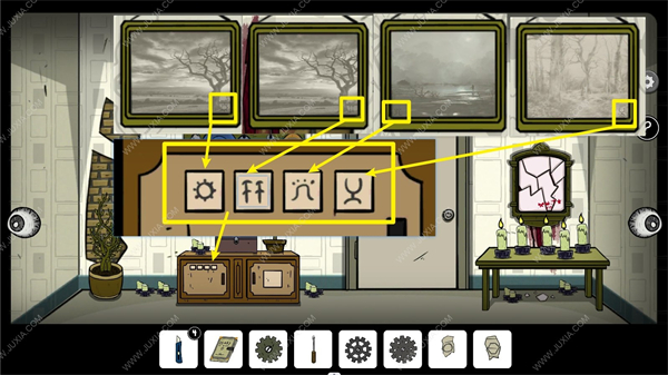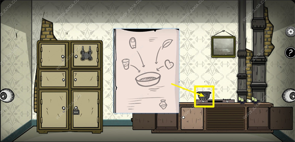 15、左转两次回到窗户场景,观察窗户场景中书台下方纸张上提示的方向符。回到厨房场景,按照纸张上方向符提示,将得到的四个把手按照方向符放在左侧柜子右上的格子上,将格子打开看到装有【心】的玻璃瓶,用【螺丝刀】或者【美工刀】将玻璃瓶打破,得到【心】。