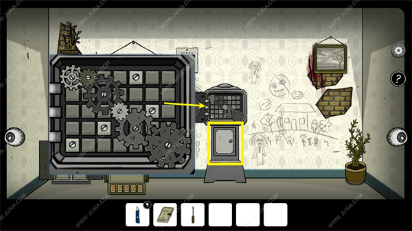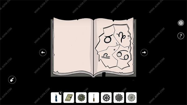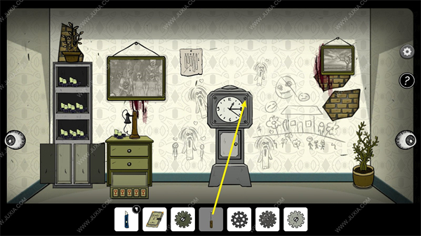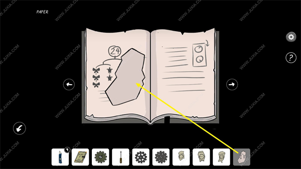 35、用从厨房场景中密码柜拿到的钥匙,打开时钟场景中左侧柜子右下方的格子,得到【纸片】。同时,在时钟场景左侧的画作背后,得到【齿轮】。