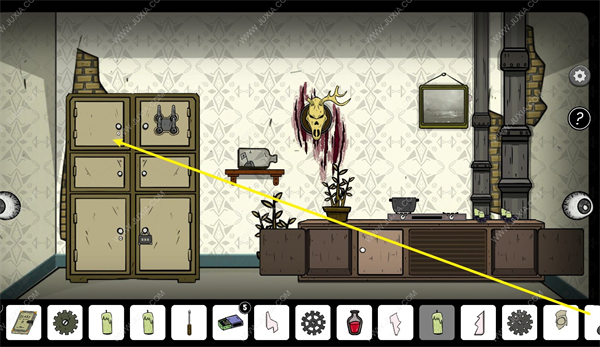 40、左转来到厨房场景,将【鹿角】接到场景中央的鹿头雕像上。